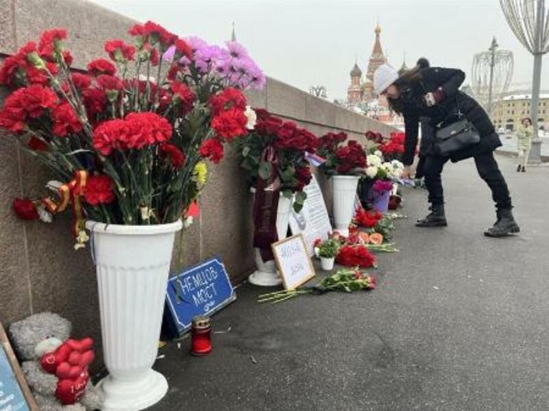 27日、野党指導者のネムツォフ元第1副首相の暗殺現場に花を手向ける人=モスクワ(共同)