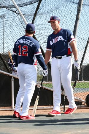 練習中にシュワバー(左)と談笑するWBC米国代表主将のヤンキースのジャッジ=フェニックス(ゲッティ=共同)