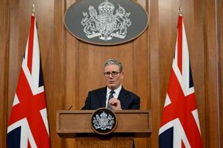 記者会見するスターマー英首相=5日、ロンドン(ロイター=共同)