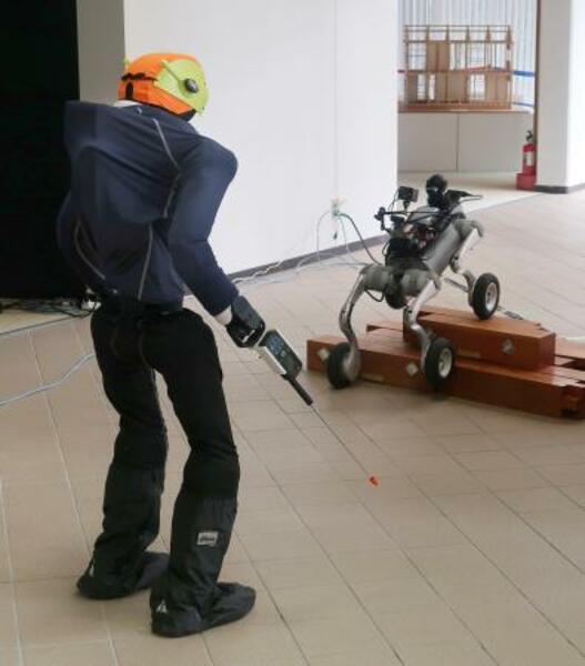 建築研究所が公開した、被災した建物の調査にAIを搭載した人型ロボットを活用する実験。奥は四足歩行ロボット=10日午後、茨城県つくば市