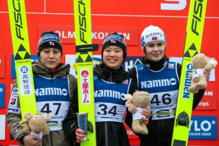 W杯ジャンプ女子個人第30戦で優勝した伊藤有希(中央)と2位の丸山希(左)=オスロ(NTB Scanpix提供・AP=共同)