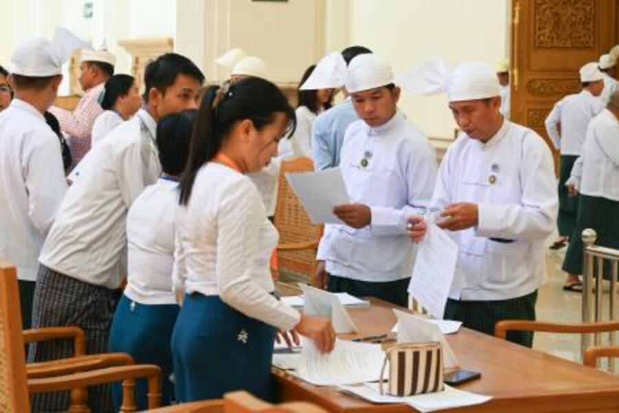 16日、ミャンマーの首都ネピドーの下院に登院し手続きする議員ら(共同)