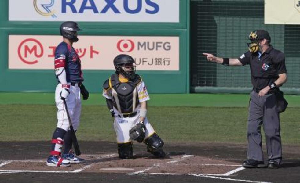 ソフトバンク戦で打者のピッチクロック違反を取られた日本代表・佐藤=2月、サンマリン宮崎