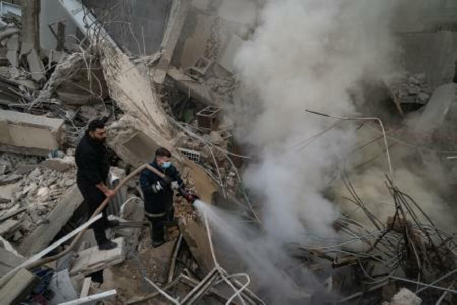 レバノンの首都ベイルートで、イスラエル軍の空爆後、壊れた建物の火を消す消防士ら=18日(ゲッティ=共同)