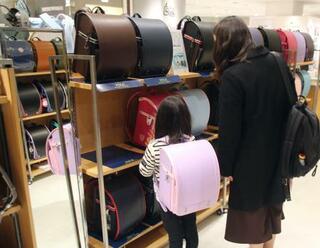 新宿高島屋のランドセル特設売り場で、品定めする親子=18日、東京都渋谷区