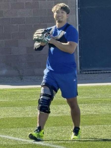 キャッチボールするアストロズ・今井達也=20日、ウェストパームビーチ(共同)