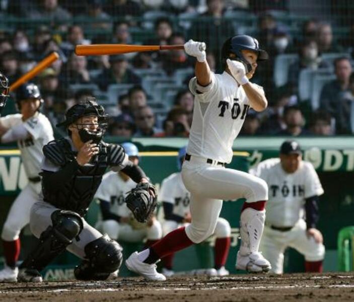 熊本工―大阪桐蔭 1回表大阪桐蔭2死二塁、谷渕が右翼へ先制打を放つ。捕手中村=甲子園