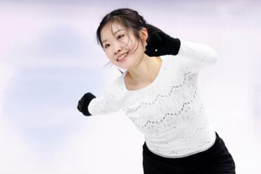 公式練習を終え、取材に応じる坂本花織=プラハ(共同)