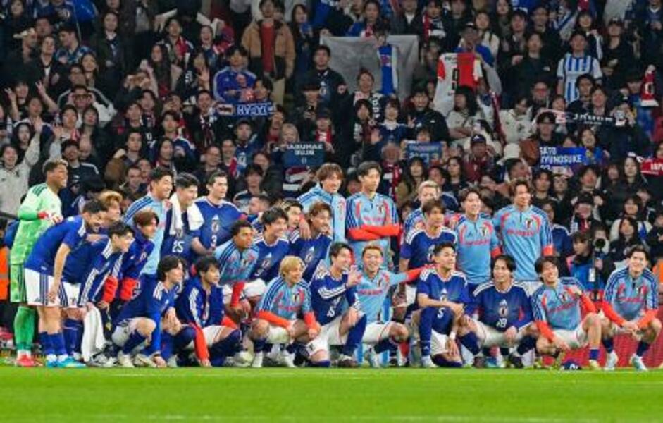 サッカー国際親善試合でイングランドから初勝利を挙げ、サポーターと写真に納まる日本代表の選手たち=3月31日、ロンドンのウェンブリー競技場(共同)