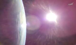 宇宙船オリオンが月へ向け軌道変更した後に撮影された地球(NASAの中継から)