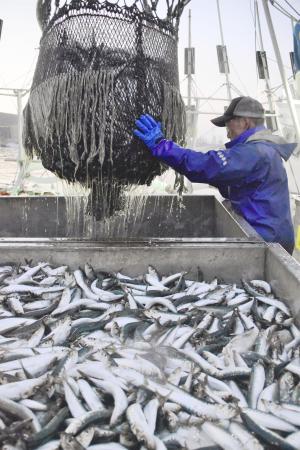 北海道根室市の花咲港で水揚げされるマイワシ=2020年9月