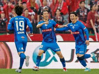 水戸―鹿島 前半、先制ゴールを決め喜ぶ水戸・渡辺(中央)=Ksスタ