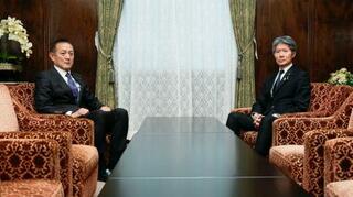 会談に臨む自民党の磯崎参院国対委員長(右)と立憲民主党の斎藤国対委員長=6日午後、国会