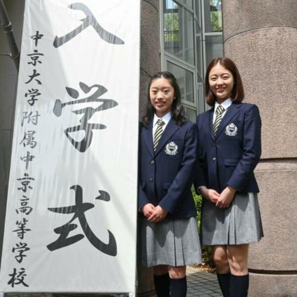 中京大中京高の入学式に出席した、フィギュアスケート女子の岡田芽依(左)と上薗恋奈=6日、名古屋市