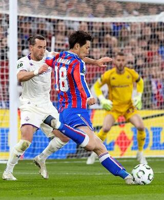 フィオレンティナ戦で攻め込むクリスタルパレスの鎌田(右)=ロンドン(共同)