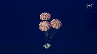 パラシュートを開き、米西部カリフォルニア州沖に着水する宇宙船オリオン=10日(NASAの中継から)