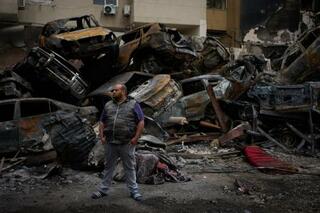 レバノンの首都ベイルートで、イスラエル軍の攻撃で焼け焦げた車両の前に立つ男性=10日(AP=共同)