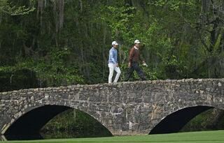 13番の「ネルソンブリッジ」を渡る松山英樹(右)と片岡尚之=7日、オーガスタ・ナショナルGC(共同)