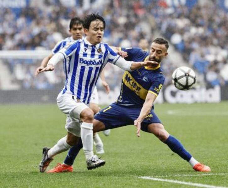 アラベス戦の後半、攻め込むレアル・ソシエダードの久保(左)=サンセバスチャン(共同)