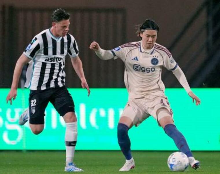 ヘラクレス戦の前半、パスを出すアヤックスの板倉(右)=アルメロ(共同)