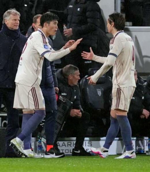ヘラクレス戦の後半、冨安(左)と交代するアヤックスの板倉=アルメロ(共同)