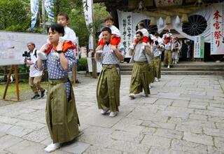 「湯登神事」で熊野本宮大社を出発する稚児たち=13日午前、和歌山県田辺市