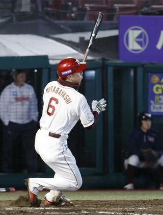 11回楽天2死三塁、村林が左前にサヨナラ打を放つ=楽天モバイルパーク