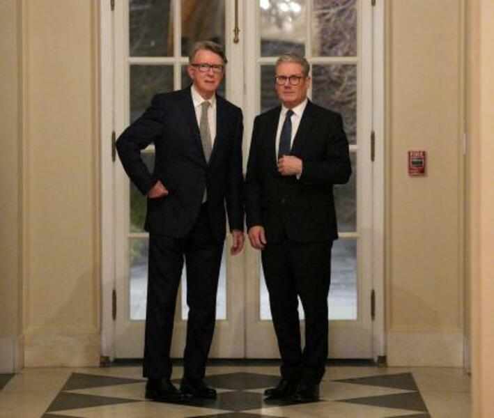 米ワシントンでスターマー英首相(右)と話すマンデルソン氏=2025年2月(ロイター=共同)