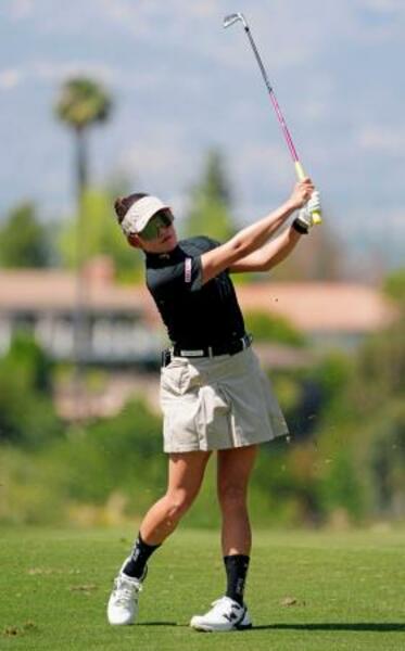 第3ラウンド、2番でショットを放つ岩井千怜。通算10アンダーで10位=エルカバレロCC(共同)