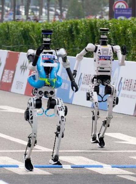 ハーフマラソン大会でスタートする人型ロボット=19日、北京(共同)