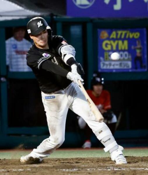 8回ロッテ2死満塁、友杉が右前に2点打を放つ=楽天モバイルパーク