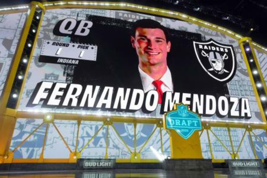 ドラフト会場の大画面に表示された、レイダーズが全体1位指名のインディアナ大QBフェルナンド・メンドーサ=23日、ピッツバーグ(ロイター=共同)