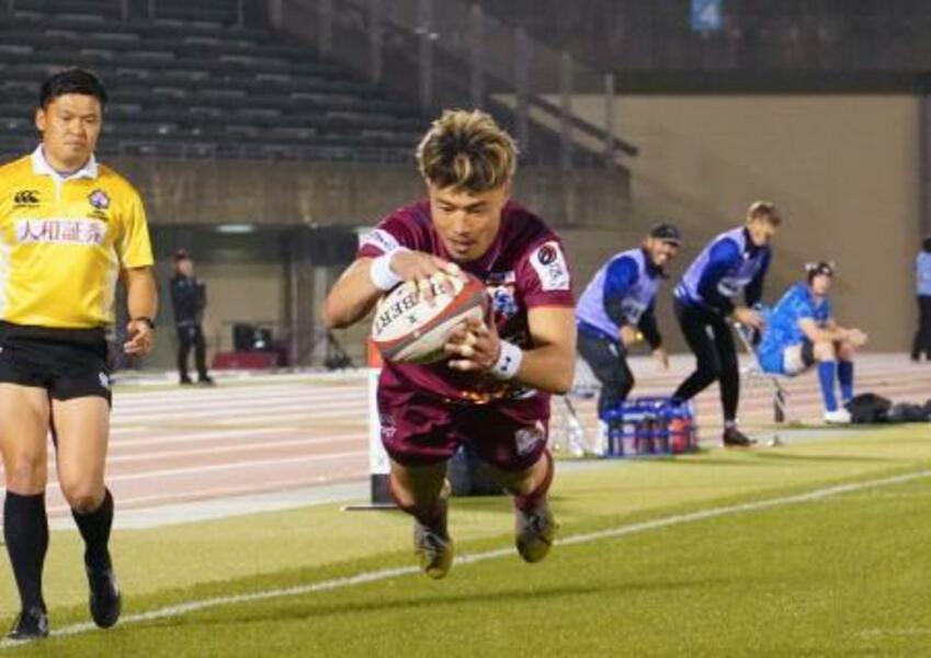 ラグビー・リーグワン2部の愛知戦でトライを決める九州・山田章。通算トライで歴代トップに並んだ=博多の森陸上競技場