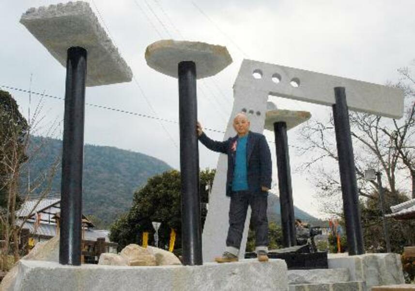 「旧金毘羅大芝居」(左後方)の鉄柱を使いモニュメントを作った篠原勝之さん=2005年3月、香川県琴平町