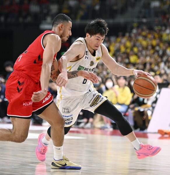 第3クオーター5分、ブレックスの比江島がドリブルで突破を図る=IGアリーナ、森田大地撮影