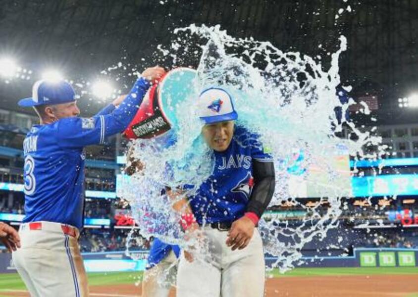 試合後に手荒い祝福を受ける、5号ソロを放ったブルージェイズ・岡本=トロント(共同)