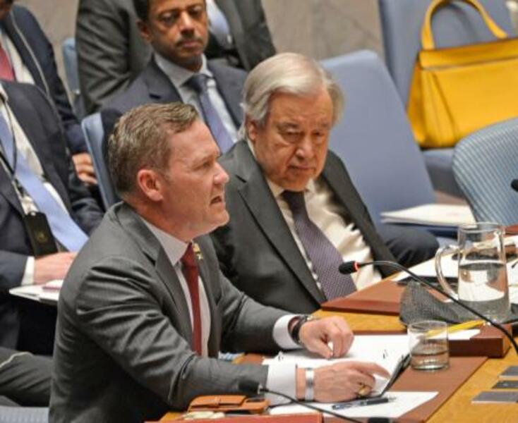 ホルムズ海峡について発言する米国のウォルツ国連大使(手前)。右隣は国連のグテレス事務総長=27日、米ニューヨークの国連本部(共同)