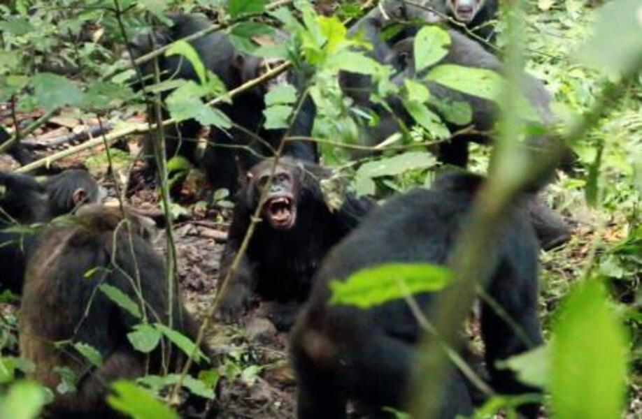 中部の雄(中央)を取り囲んで襲う西部のチンパンジー=2019年、ウガンダ・キバレ国立公園(アーロン・サンデル氏提供)