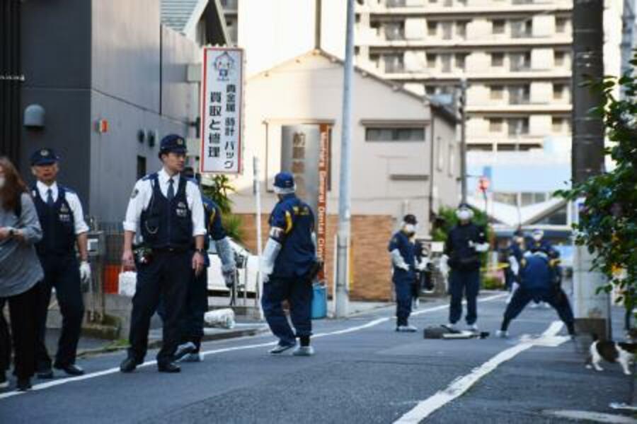 金塊が奪われたとされる現場付近を調べる警視庁の捜査員=28日午後5時3分、東京都葛飾区