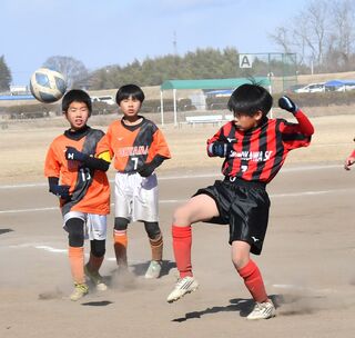前半14分、ヴェルフェ矢板U12vert(塩南)のFW中村(右)が同点ゴールを決める=真岡鬼怒自然公園サッカー場