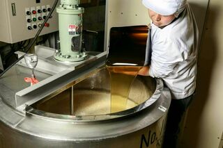 タンクに蜂蜜を投入するミードの醸造作業工程=天鷹酒造