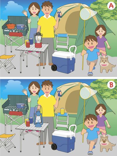 キャンプシーズンがやってきました!アウトドアで自然を満喫してはいかがでしょうか。本県の素晴らしい自然の中で、家族や仲間ときっと楽しい思い出がつくれることでしょう。 では問題です。AとBのイラストで、違いは何カ所あるでしょう?