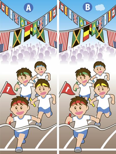 すがすがしい陽気の中になり、各地で運動会が行われていますね。日ごろの練習や、運動の成果を発揮して、1等賞目指してがんばれ〜!! では問題です。AとBの、対抗リレーのイラストを見比べて、違いは何カ所あるでしょう?