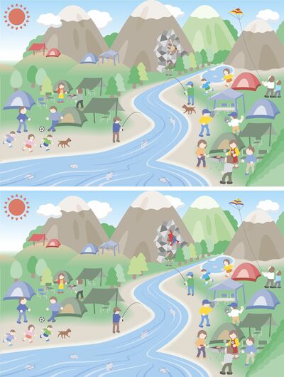アウトドアが気持ちいい季節です。家族や仲間と山や川などへ出かけて、思い切り楽しんでリフレッシュしましょう! では問題です。二つのイラストを見比べて、何カ所違いがあるでしょうか?