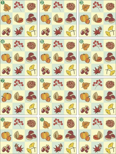 秋も深まる季節、大自然が織りなす一瞬の自然美。秋の味覚を堪能する機会が増えてきて、ついついウエストが気になる日々を過ごされている方もいるのでは。 さて問題。同じイラストは何番と何番でしょうか。