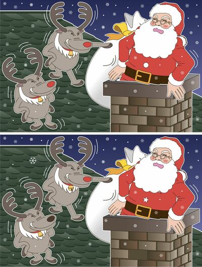 世界中の良い子にクリスマスプレゼントを届けるため、大忙しのサンタクロース。慌てて煙突に入ると抜けなくなってしまいました。トナカイには笑われるし、早くプレゼントを届けなければならないし…。がんばれサンタさん! では問題です。二つのイラストを見比べて、違いは何カ所あるでしょう?