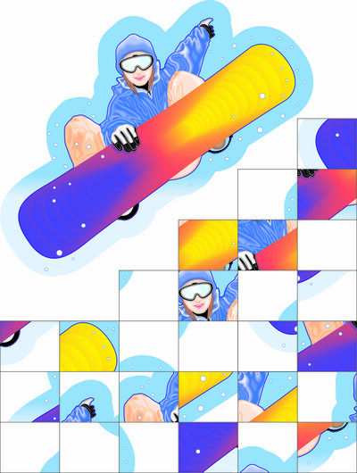ウインタースポーツの季節がやってきました!ゲレンデに飛び出す前にこの問題に答えてね!ジャンプするスノーボーダーを分割しました。元通り並べれば上のイラストになりますが、何枚か間違っています。 さて間違いは何枚あるでしょう?