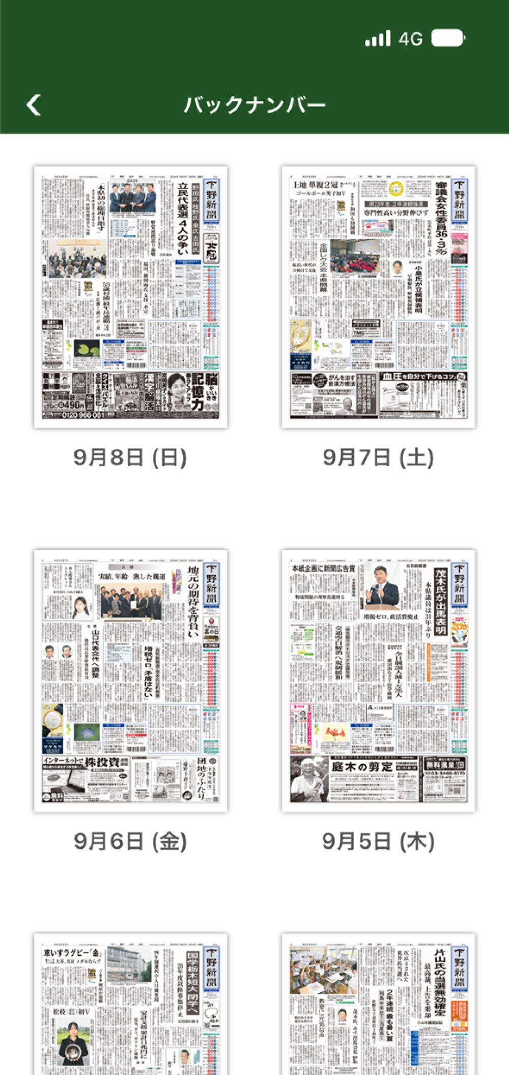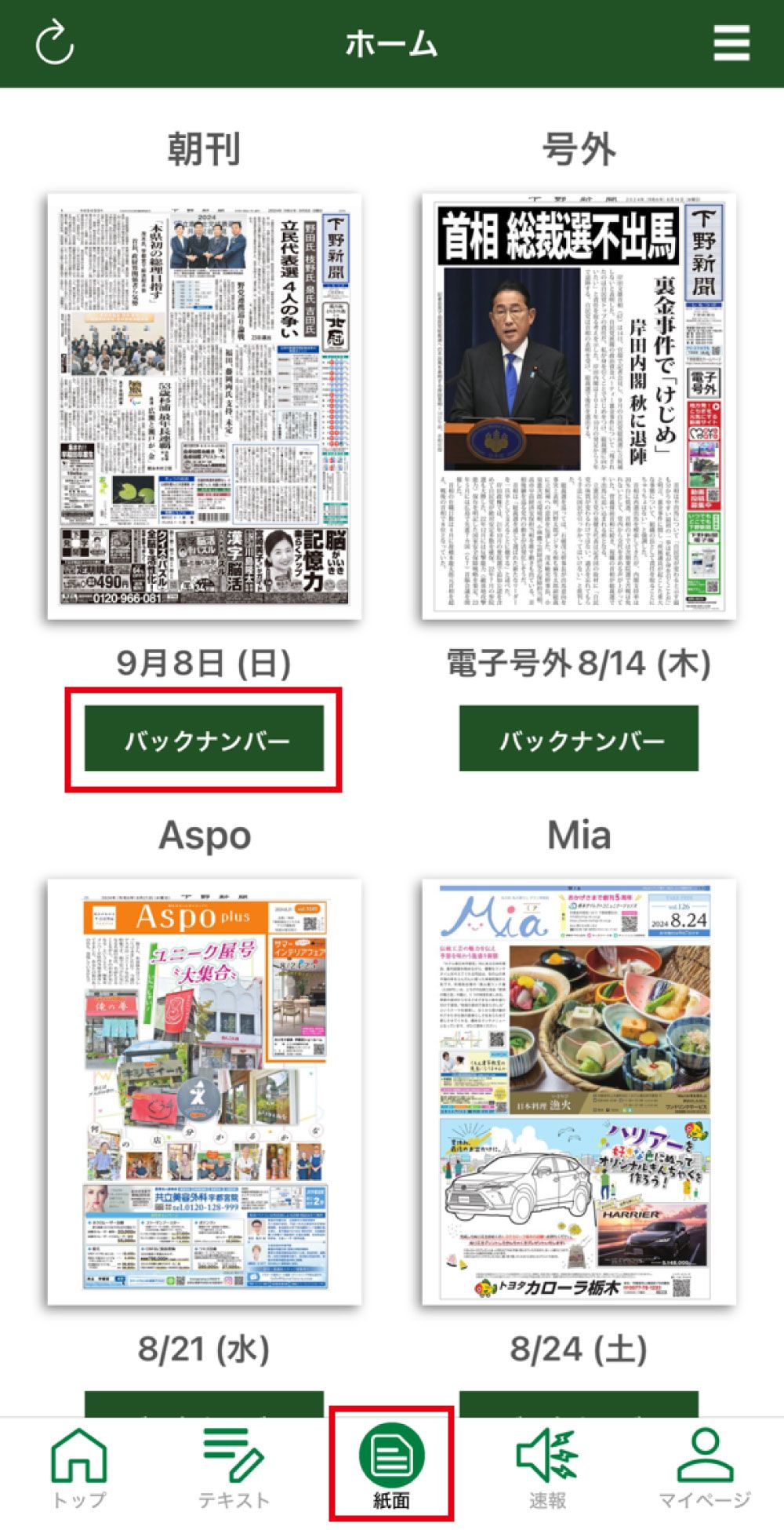 「紙面」には閲覧できる紙面が並びます。「バックナンバー」をタップすると、過去31日間の紙面をお読みいただけます。