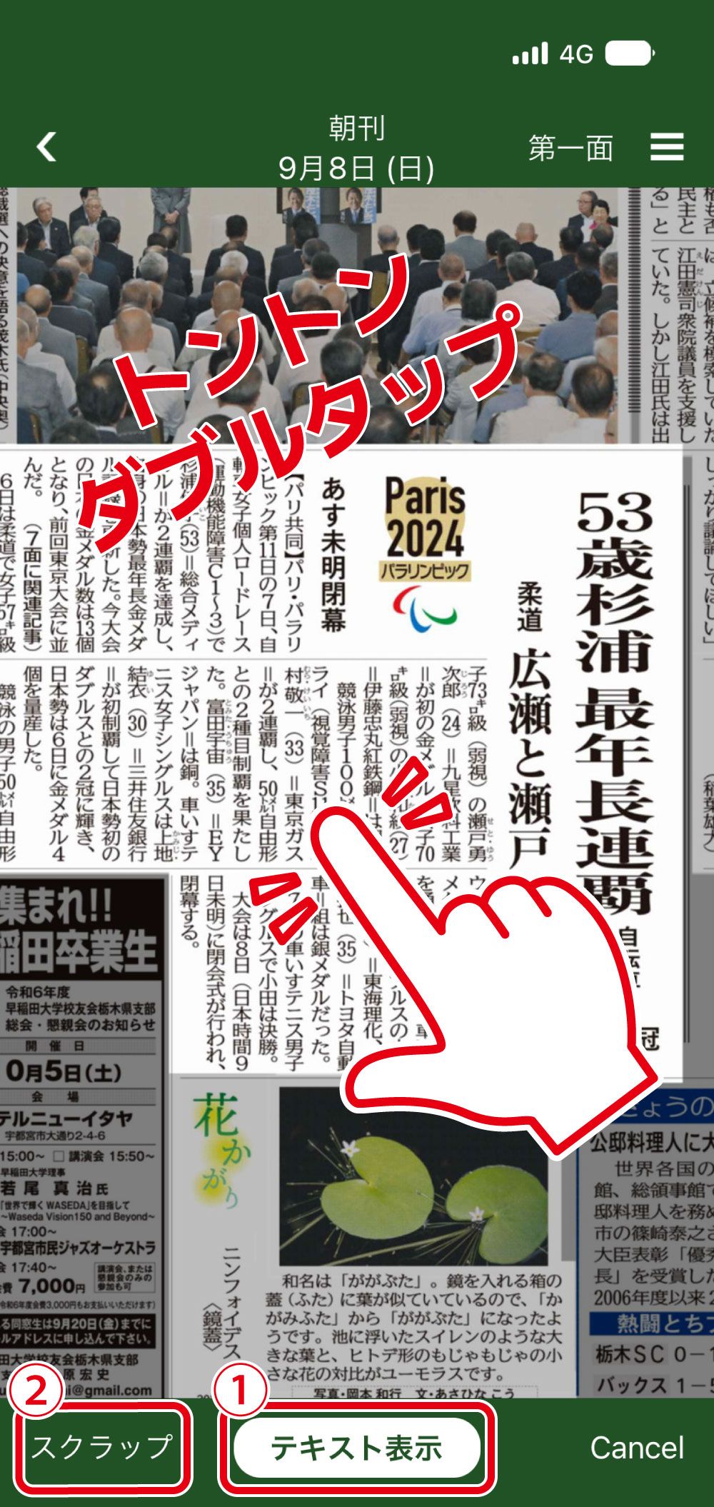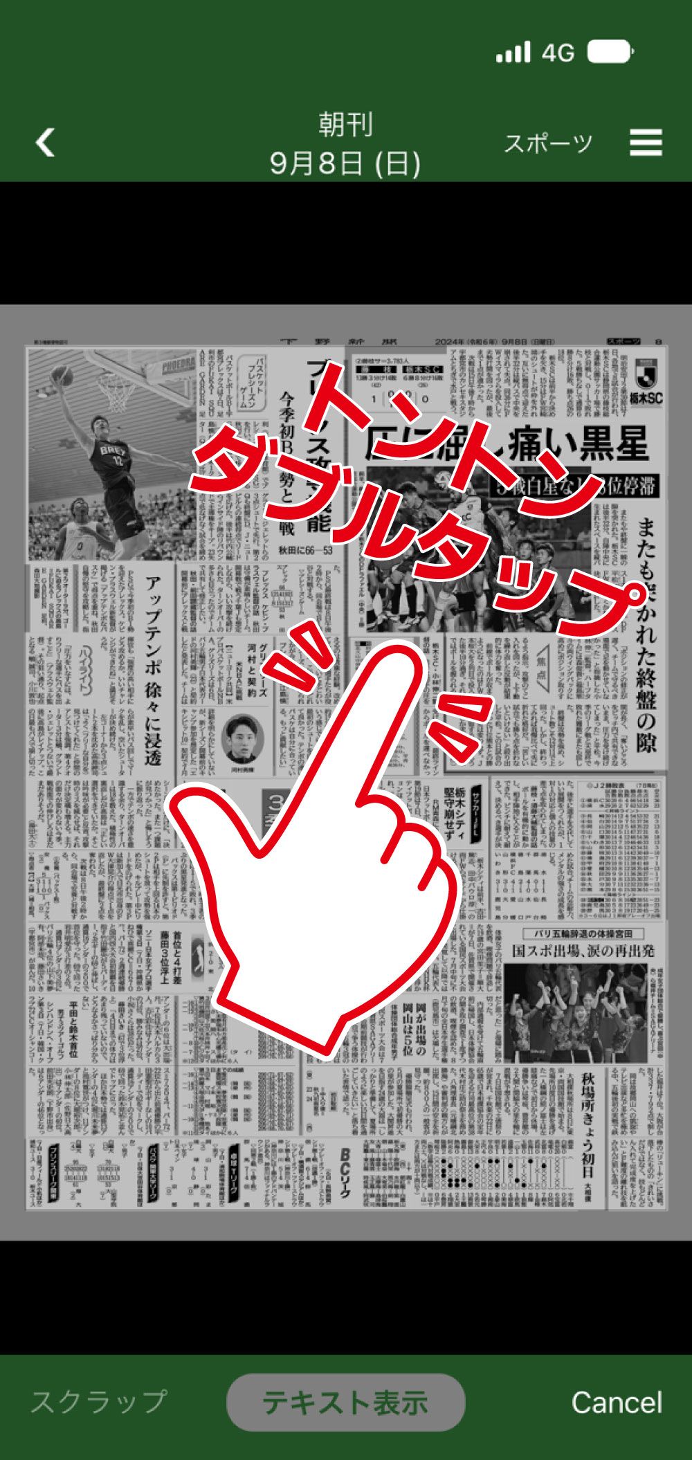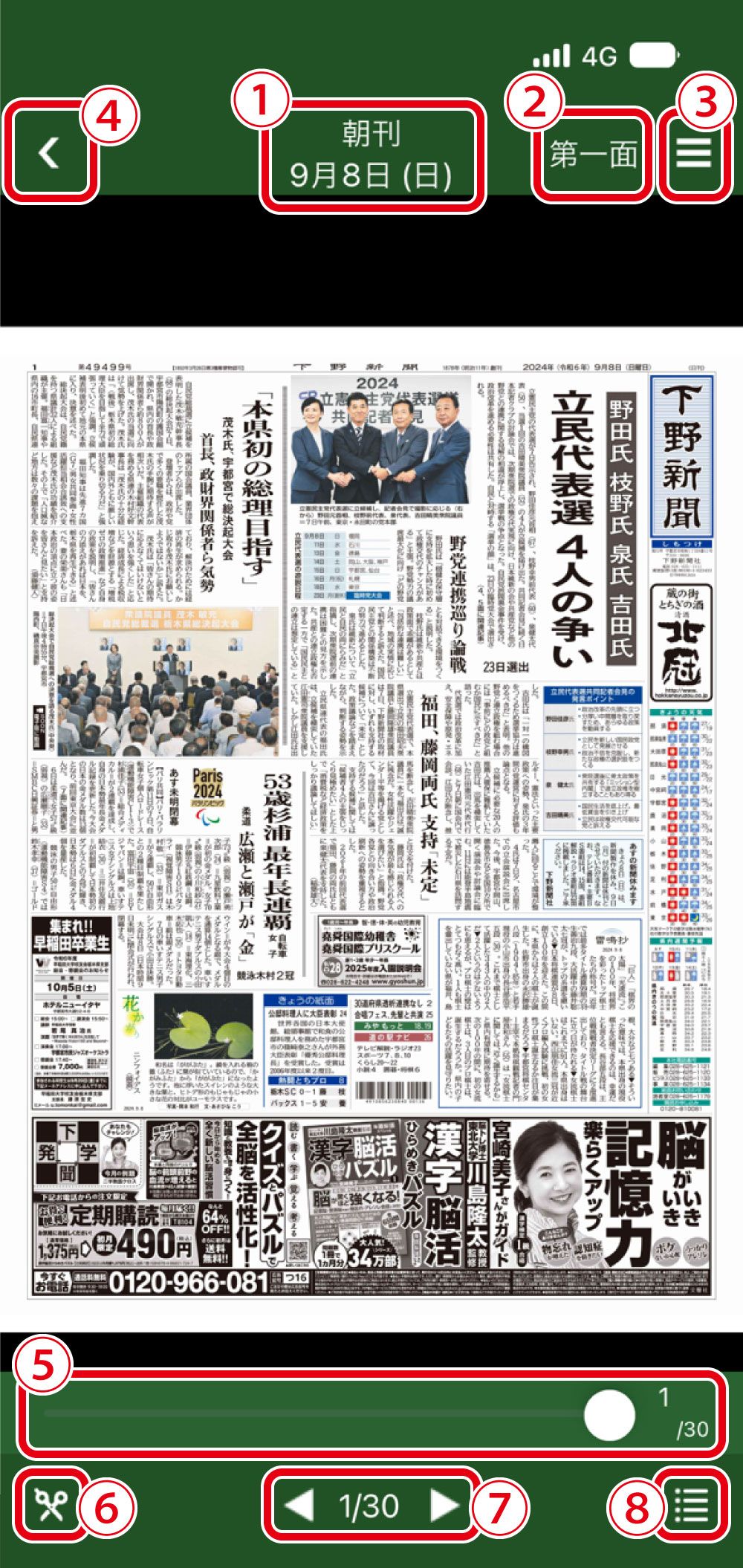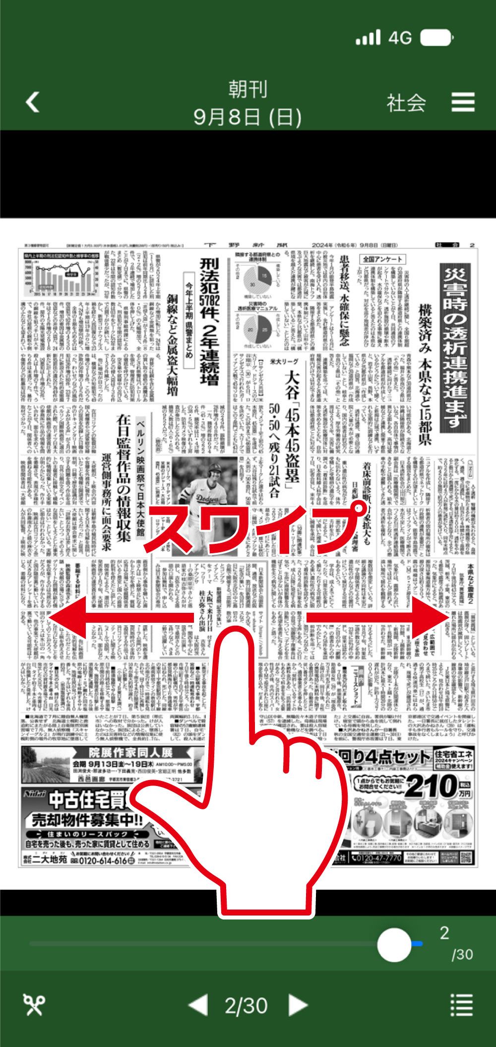 ログイン後、読みたい紙面をタップします。紙面をタップすると、画面上下部に「メニューバー」が表示されます。