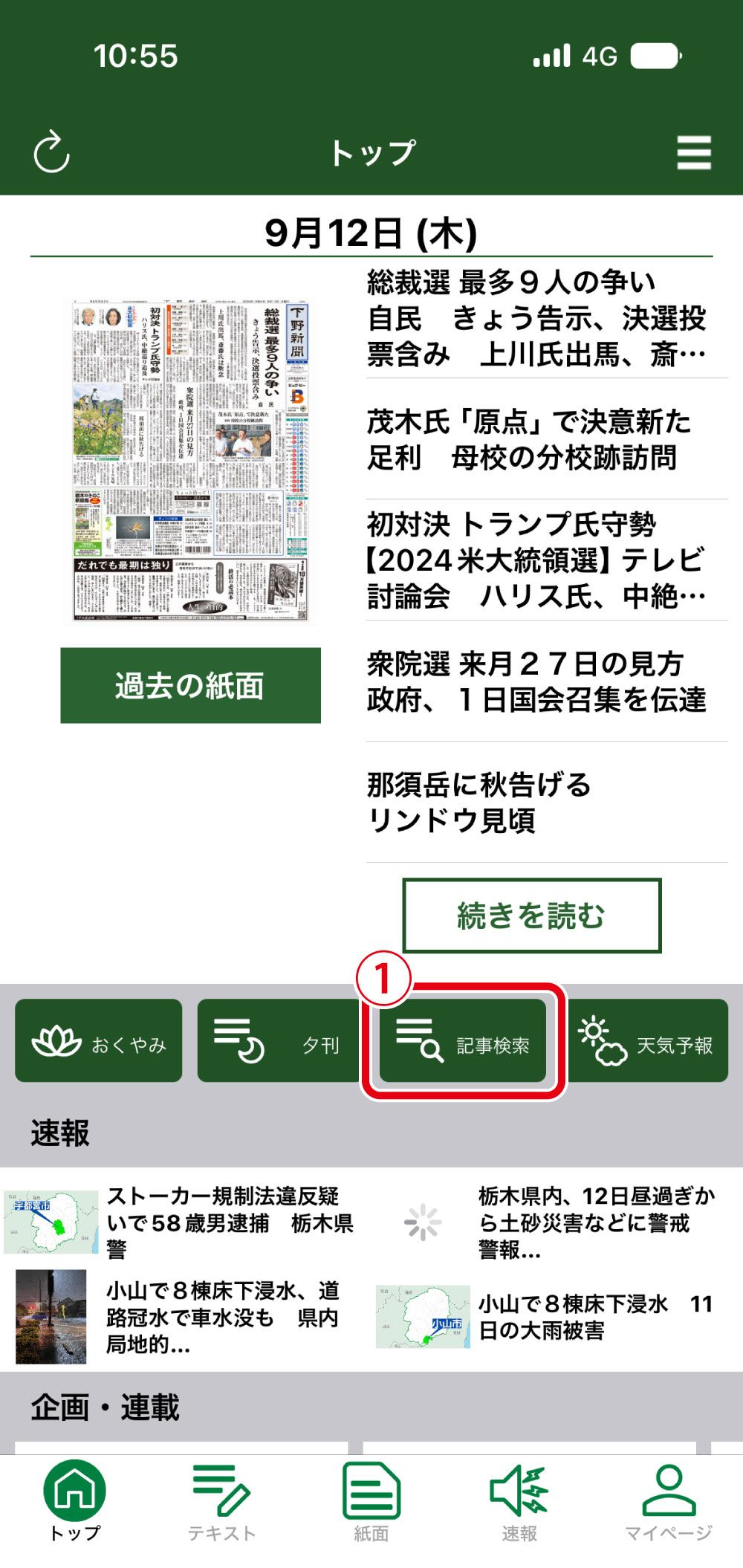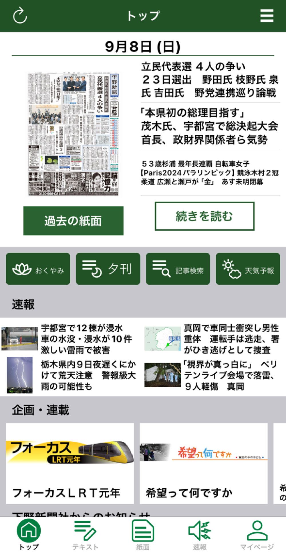 アプリを起動すると「トップ画面」が起動します。今日の1面の記事がピックアップされ、おくやみ、夕刊、記事検索、天気予報、速報、企画・連載記事へアクセスできます。